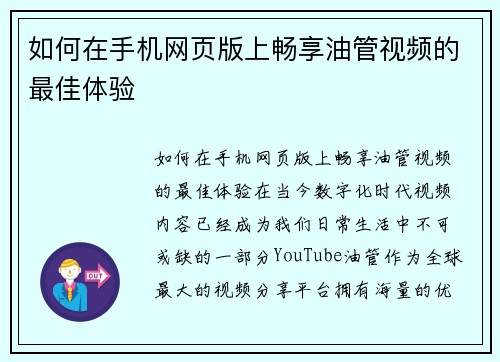 如何快速找到YouTube官网登录入口的详细指南 在当今数字化时代,YouTube已成为全球最受欢迎的视频分享平台之一。无论是观看视频、上传内容还是与朋友分享,YouTube都为用户提供了丰富的功...